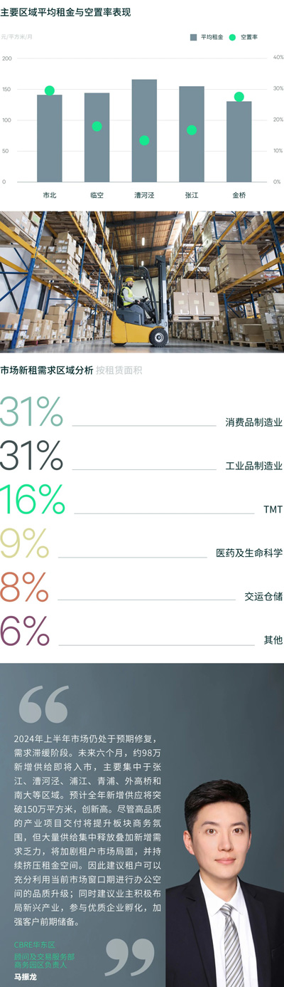 搬遷需求的持續(xù)釋放仍為當(dāng)前主要趨勢,上半年需求占比65%。同時租戶采取更保守的策略也使得續(xù)租需求有所增加。就行業(yè)方面,以科技創(chuàng)新為核心的新質(zhì)生產(chǎn)力需求逐漸成為主流。首先,消費景氣行情帶動消費品制造業(yè)以31%占比位居租賃需求首位。主要得益于汽車企業(yè)大面積租賃活動以及多點開花的選址趨勢,如小鵬汽車落址張江、麥格納汽車技術(shù)落址臨空,問界汽車和奔馳落址金橋;另錄得消費品巨頭利潔時和花王落址漕河涇。硬科技投資回暖帶動半導(dǎo)體行業(yè)延續(xù)旺盛需求態(tài)勢,在張江、金橋板塊積極搬遷租賃,如海光芯片、芯馳科技搬遷至張江中區(qū)新項目。同時也錄得多家裝備制造類企業(yè)需求,因此工業(yè)品制造業(yè)以31%占比位居需求第二。TMT企業(yè)需求相比有所減弱,上半年需求占比16%位居第三。但人工智能及軟件系統(tǒng)開發(fā)類新興企業(yè)表現(xiàn)亮眼,呈現(xiàn)擴(kuò)租及升級搬遷需求,其中不乏涉及人工智能算力、大模型等前沿企業(yè)。