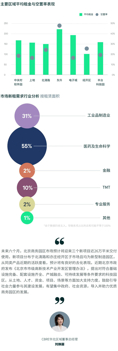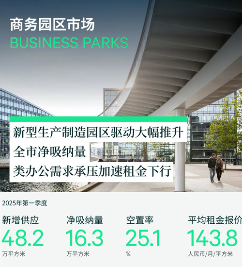 2025年第一季度,北京商務(wù)園區(qū)市場迎來新增供應(yīng)小高峰,錄得五個新項目共計體量48.2萬平方米交付使用,其中三個為具有“研發(fā)、中試、生產(chǎn)”一體化功能的新型制造園區(qū),吸引了眾多有成果轉(zhuǎn)化需求的企業(yè)入駐,且多為萬平方米以上整棟租賃需求,入市后即有共18.8萬平方米面積去化,成為本季度整體凈吸納量的貢獻主力。此外,定向為醫(yī)藥及生命科學(xué)產(chǎn)業(yè)設(shè)計的專項園區(qū)占總新增面積的86%,創(chuàng)該板塊單季新增供應(yīng)量歷史紀錄。