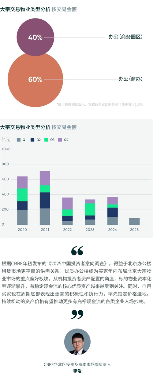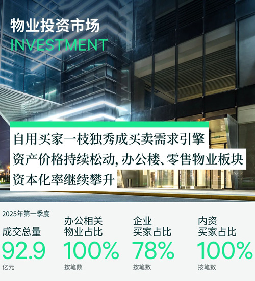 2025年第一季度,北京物業(yè)投資市場活躍度仍略顯溫和,一共錄得9筆交易,累計交易總額92.9億元,環(huán)比、同比分別下降4.8%和14.7%。