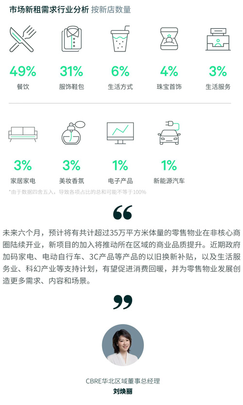 北京1-2月社銷總額同比微降0.1%,其中餐飲收入下降4.1%,商品零售增長0.3%,較去年全年數(shù)字均有改善,但仍低于去年同期水平,消費回暖仍不明朗。反映在拓店需求上,本季度餐飲新增店鋪占比49%,較上季度有小幅回落,主要原因為中高端餐飲業(yè)態(tài)擴張步伐略有放緩,而小吃快餐(如濱壽司、肉肉大米)、烘焙甜品(如倫敦烘焙小鎮(zhèn)、宿咕)及茶飲果汁類(如本就茶飲、爺爺不泡茶)消費仍舊占據(jù)主流,并保持穩(wěn)定的拓店速度。零售方面,奢侈品類調(diào)整線下布局,關(guān)閉低效門店,季內(nèi)在CBD、王府井等核心商圈均錄得閉店。運動戶外品牌(如胡丁尼、布魯克斯)在全城多點開花,帶動服飾鞋包新開店鋪數(shù)量占比環(huán)比小幅提升至31%。珠寶首飾類開鋪亦持續(xù)活躍,而美容、保健類等生活服務(wù)類熱度有所減弱。核心商圈品牌更迭更加活躍、業(yè)主為品牌提供更多優(yōu)質(zhì)的鋪位選擇,新開店鋪核心商圈占全市比環(huán)比大幅提升。與此同時,個別面對消費格局的轉(zhuǎn)變而未能及時調(diào)整自身運營策略的老牌項目持續(xù)流失品牌客戶,導(dǎo)致季內(nèi)凈吸納量錄得負值,空置率環(huán)比上漲0.1個百分點至7.4%。