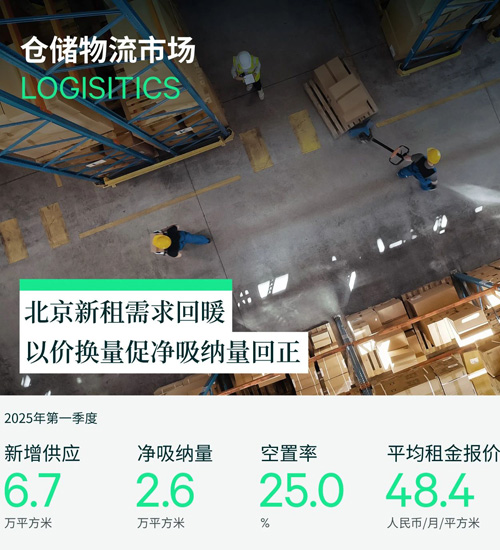 2025年第一季度,北京平谷馬坊交付一個倉儲物流項目,帶來6.7萬平方米新增供應(yīng)。以供應(yīng)鏈及合同物流企業(yè)為代表的第三方物流占季末總新租面積的60%,而純電商及制造業(yè)需求有小幅回升,帶動季內(nèi)凈吸納量在歷經(jīng)連續(xù)四個季度的負值后首次回正錄得2.6萬平方米。市場新租需求有所回暖,季內(nèi)錄得數(shù)個來自電商或制造業(yè)超過萬平方米的大面積擴增,但租戶整合、縮減、降級活動也在同步出現(xiàn)。在租戶降本增效策略的導(dǎo)向下,項目間表現(xiàn)逐步分化,核心區(qū)位、樓齡較新且率先增加租金靈活性的項目更受歡迎,反之則有較大的客戶流失風(fēng)險。全市空置率環(huán)比上漲0.6個百分點至25.0%,空置面積主要來自順義空港和平谷馬坊。