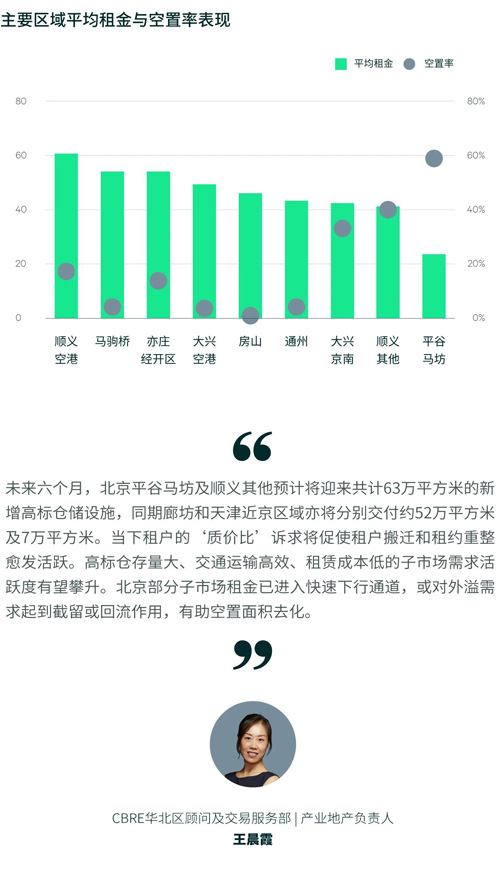 季末全市平均租金達每月每平方米48.4元,同樣本比環(huán)比跌幅走闊至-3.9%。平谷馬坊、順義其他兩個空置率最高的非核心子市場領(lǐng)跌,并成為季內(nèi)凈吸納量最高的兩個子市場。在存量市場流動刺激下,通州、順義空港、亦莊經(jīng)開區(qū)等核心子市場的租金持續(xù)松動,本季度加速下調(diào)。