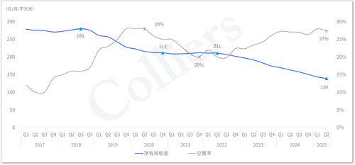 深圳甲級(jí)寫字樓凈有效租金和空置率
