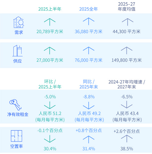 2025年上半年,沈陽寫字樓市場凈吸納量較去年有所提升,但市場去化主要由新增供應(yīng)項目的預(yù)租貢獻,存量項目的去化速度相對較緩。當前較高的空置率水平,加上未來新項目的入市,市場供需關(guān)系的調(diào)整將需要一定時間。預(yù)計短期內(nèi)租金水平仍將面臨一定的下行壓力。