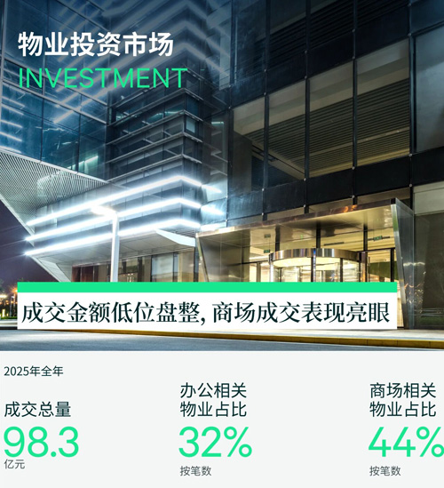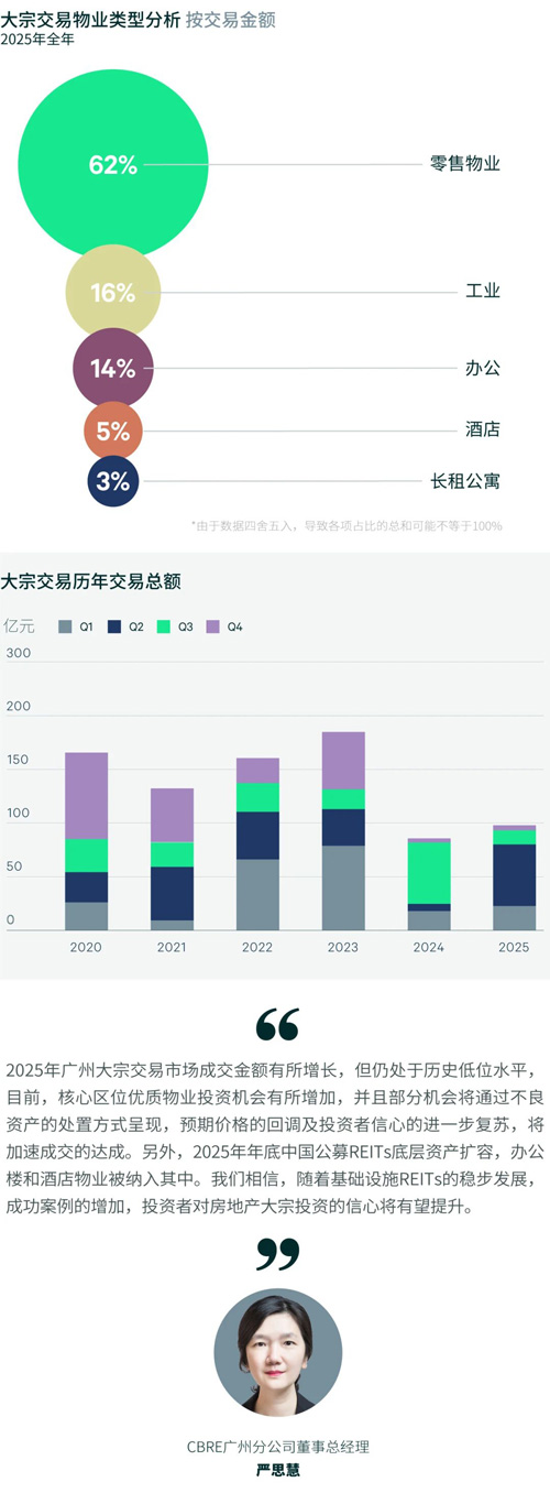 2025年全年廣州共錄得錄得25宗,共98.3億元的大宗物業(yè)成交,成交金額同比增長(zhǎng)13.9%。其中,商場(chǎng)是成交數(shù)量及金額最高的業(yè)態(tài),占總成交金額的61.8%,成交同比提高131%。具體成交主要為萬(wàn)達(dá)購(gòu)物中心的大宗出售,新住宅項(xiàng)目的底商或商業(yè)配套出售,以及通過(guò)不良資產(chǎn)處置釋出的傳統(tǒng)城區(qū)商業(yè)成交。而其他物業(yè)類(lèi)型中,工業(yè)和酒店的成交金額錄得小幅同比上升,辦公樓和公寓的成交金額則錄得同比下滑。