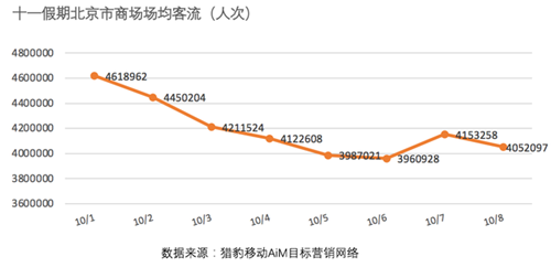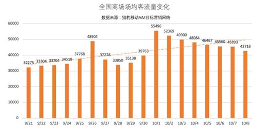 從全國來看,據獵豹移動機器人監(jiān)測,“十一”期間全國商場場均客流較節(jié)前一周增長31.6%,全國商場日總客流平均超過4775萬人次。