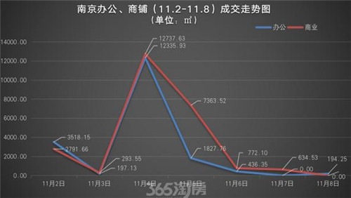 在11月2日-11月8日的統(tǒng)計周期內,周成交量與前一周相比下跌較為明顯。商鋪和辦公的銷量雙雙在11月4日達到峰值,隨后便開始下滑。