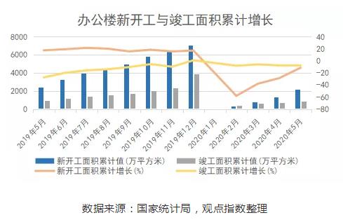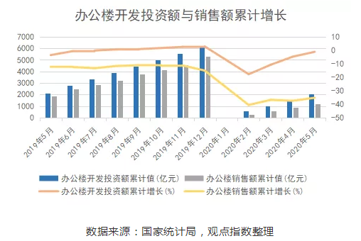 從投資和需求的角度來(lái)看,1-5月辦公樓開(kāi)發(fā)投資額累計(jì)值錄得2080億元,同比增長(zhǎng)-1.2%,雖仍為負(fù)數(shù),但已基本恢復(fù)至去年同期水平;而銷(xiāo)售額累積值的增長(zhǎng)則恢復(fù)較慢,僅為去年同期的三分之二左右。事實(shí)上,疫情至今,我國(guó)辦公樓開(kāi)發(fā)投資恢復(fù)得較快,但銷(xiāo)售方面恢復(fù)較慢,投資者雖然持審慎態(tài)度。