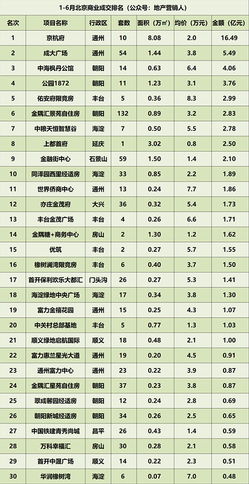 2020年1-6月,北京商業(yè)市場新增供應(yīng)809套,同比上漲158%;成交1185套,下降20%;成交面積32.18萬㎡,上漲32%;成交均價24985元/㎡,下降15%;成交金額80.4億元,上漲12%;目前存量18631套,同比上漲5%。