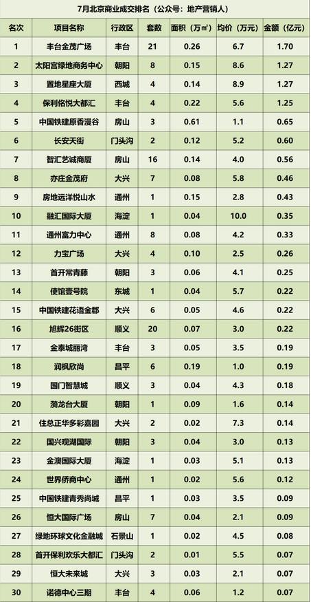 7月,北京商業(yè)市場新增供應(yīng)59套,環(huán)比上漲84%;成交172套,環(huán)比下降39%;成交面積3.21萬㎡,環(huán)比下降17%;成交均價(jià)38311元/㎡,環(huán)比上漲15%;成交金額12.3億元,環(huán)比下降5%;目前存量18679套。其中,豐臺(tái)金茂廣場以1.7億元的月度成交額位居成交榜首。