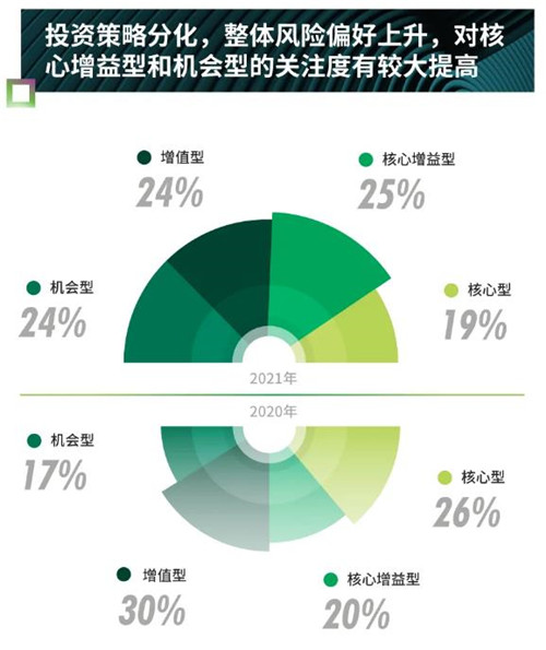 投資策略方面,投資者的風險偏好與回報要求有所上升,對核心增益型、機會型和不良資產(chǎn)投資的意向占比升至歷史新高。疫情對資產(chǎn)價格的短期沖擊和高杠桿開發(fā)商處置資產(chǎn)意愿的增強為機會型投資者創(chuàng)造了一個收購窗口期。同時,關(guān)注穩(wěn)定租金收入的國內(nèi)險資、主權(quán)財富基金等機構(gòu)投資者更傾向于核心增益型項目。