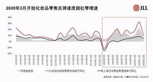 生在一個(gè)“顏值即正義”的看臉時(shí)代,雖然在去年初,居家隔離和出門(mén)戴口罩等政策和口罩讓化妝成為了“非必要活動(dòng)”。但國(guó)內(nèi)疫情趨緩后,化妝品零售額的反彈速度從3月開(kāi)始就超過(guò)了社會(huì)消費(fèi)品零售總額的增速。