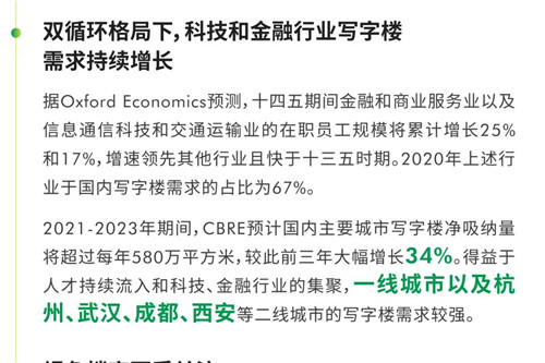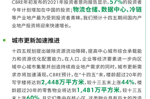 CBRE中國區(qū)總裁李凌表示,站在“十四五“的開局之年展望未來,以科技創(chuàng)新和消費升級為支點,“內(nèi)循環(huán)”戰(zhàn)略和可持續(xù)發(fā)展理念將促進中國經(jīng)濟和社會發(fā)展全面提質(zhì)增效;而進一步縮減外資準入負面清單、推動RCEP實施、制度型開放等措施將引領(lǐng)中國對外開放邁向新高度。CBRE將繼續(xù)依托全球平臺和本地化理念,以商業(yè)地產(chǎn)服務(wù)為紐帶,幫助更多優(yōu)質(zhì)企業(yè)和境內(nèi)外的投資機構(gòu)/者在中國取得成功,并推動房地產(chǎn)科技賦能、韌性城市和綠色建筑的發(fā)展。