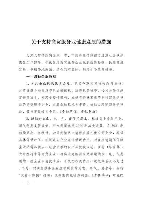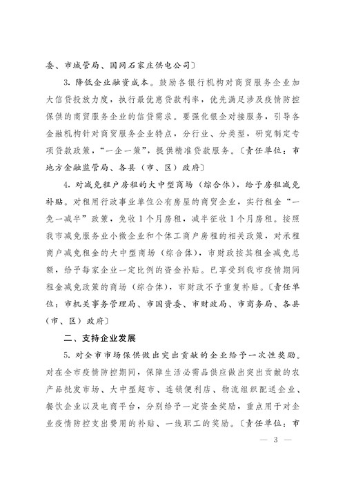 《措施》提出,對減免租戶房租的大中型商場(綜合體),給予房租減免補貼。對租用行政事業(yè)單位公有房屋的商貿(mào)企業(yè),實行租金“一免一減半”政策,免收1個月房租,減半征收1個月房租。按照我市減免服務(wù)業(yè)小微企業(yè)和個體工商戶房租的相關(guān)政策,對承租商戶減免租金的大中型商場(綜合體),市財政按其租金減免總額,給予每家企業(yè)一定比例的資金補貼。.