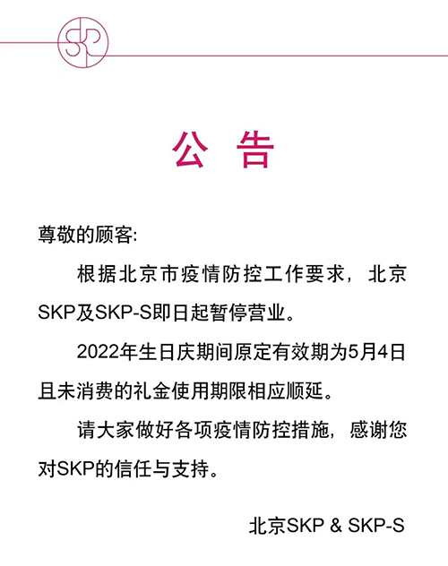 房訊網(wǎng)訊 4月29日,北京華聯(lián)(SKP)百貨有限公司發(fā)布公告稱,根據(jù)北京市疫情防控工作要求,北京SKP及SKP-S即日起暫停營業(yè)。2022年生日慶期間原定有效期為5月4日且未消費的禮金使用期限相應(yīng)順延。