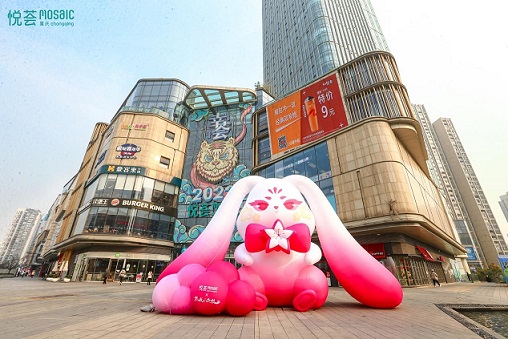 重慶悅薈1/3號(hào)門廣場(chǎng)外5米高的聯(lián)名IP定制兔,既是IP形象的抓取,又是新年兔年形象的昭示;