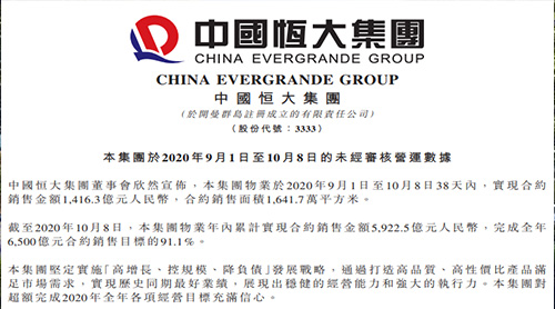 10月9日,中國恒大發(fā)布最新公告,9月1日-10月8日共計38天,公司累計實現銷售1416.3億,創(chuàng)同期歷史新高。截至目前,恒大年內已實現銷售額5922.5億,完成全年6500億銷售目標的91%。