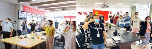 (2020年7月,華遠地產黨總支、外埠城市公司屬地支部慶祝建黨99周年主題黨課重溫入黨誓詞)