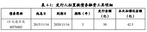 萬(wàn)達(dá)商管表示,本期中期票據(jù)發(fā)行擬募集資金42.5億元,擬全部用于償還大連萬(wàn)達(dá)商業(yè)地產(chǎn)股份有限公司2015年度第二期中期票據(jù)。詳情如下: