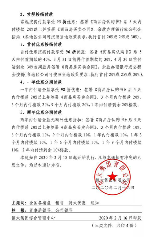 據(jù)文件顯示,2020年2月18日至2月29日期間,全國各在售樓盤住宅(含公寓及寫字樓),可享受75折優(yōu)惠;2020年3月1日至3月31日期間,全國各在售樓盤住宅(含公寓及寫字樓),可享受78折優(yōu)惠。