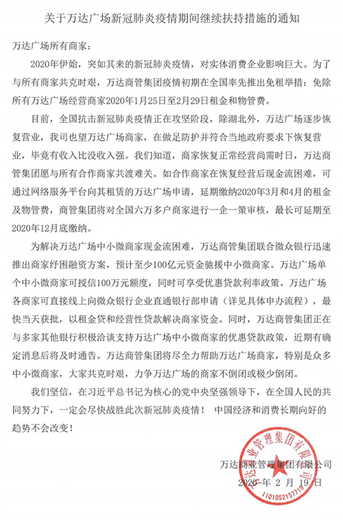 房訊網(wǎng)訊 繼宣布減免全國所有萬達廣場商家2020年1月25日-2月29日租金和物管費后,2月20日,萬達商業(yè)管理集團再續(xù)力,發(fā)布一則《關于萬達廣場新冠肺炎疫情期間繼續(xù)扶持措施的通知》,對全體商戶提出具體扶持措施。