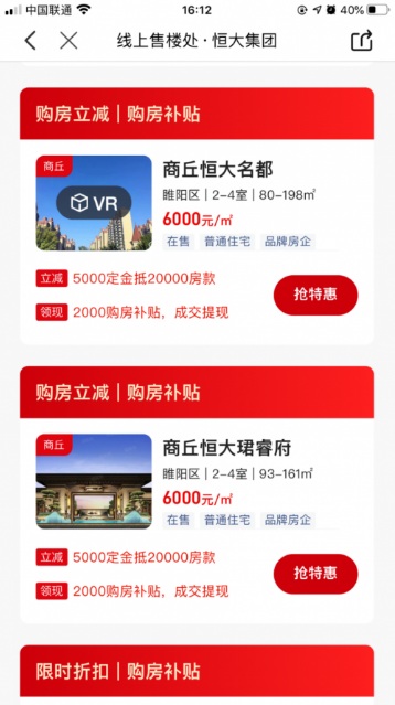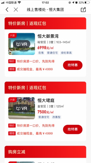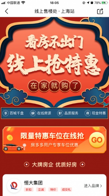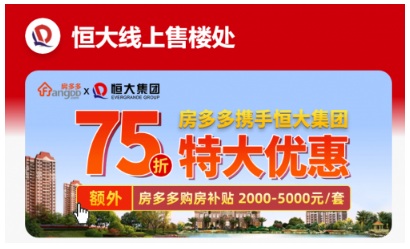 2月中旬,針對恒大推出的75折購房優(yōu)惠,房多多APP上線恒大品牌專區(qū),消費者可以實現(xiàn)一站式看盡恒大全國項目,并可通過在線支付小額定金來鎖定房源,還可疊加“購房立減”、“限時折扣”、“返現(xiàn)紅包”等多重購房特權。