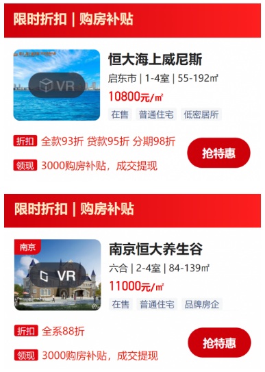 再來看看“限時折扣”,房多多平臺上的樓盤折扣分為“全款93折”、“貸款95折”、“分期98折”和“全系88折”兩種,其中上海恒大海上威尼斯、無錫恒大觀瀾府、南京句容恒大文化旅游城、武漢恒大文化旅游城等房源享受第一種折扣,南京恒大養(yǎng)生谷和恒大湖山半島等享“全系88折”優(yōu)惠。