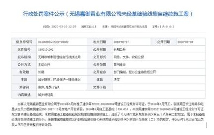 嘉御置業(yè)違反了《無錫市城鄉(xiāng)規(guī)劃條例》第三十八條第二款規(guī)定,屬于未經(jīng)基礎驗線擅自繼續(xù)施工的行為。無錫市城市管理綜合行政執(zhí)法局依據(jù)《無錫市城鄉(xiāng)規(guī)劃條例》第四十九條第(二)項的規(guī)定,于2019年8月27日作出罰款人民幣5000元的行政處罰。處罰公開日期為2020年3月19日。