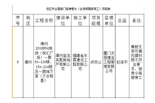 2019年11月21日,福建省住房和城鄉(xiāng)建設廳網(wǎng)站發(fā)布《關于2019年8-10月份房建市政工程安全質量監(jiān)督檢查情況的處理意見》顯示,漳州2018P04地塊(悅匯廣場)一期5#-13#樓、15#-21#樓及一期地下室(不含樁基)被責令局部停工,因其模板支架可調托撐材質不符合要求。該工程建設單位為漳州寶龍英聚房地產(chǎn)有限公司;施工單位為福建省東霖建設工程有限公司;監(jiān)理單位為廈門天恒建業(yè)工程管理有限公司。