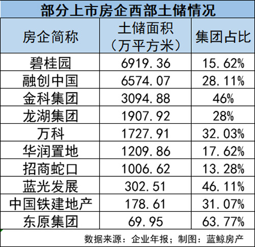 而從房企的土儲(chǔ)面積來(lái)看,碧桂園、融創(chuàng)中國(guó)、萬(wàn)科等全國(guó)性房企均在西部地區(qū)擁有大量的土地儲(chǔ)備。截至2019年12月31日,碧桂園在西部地區(qū)擁有土儲(chǔ)面積6919.36萬(wàn)平方米,高居榜首;融創(chuàng)以6574.07萬(wàn)平方米的土地儲(chǔ)備位居第二。