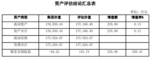 按照資產(chǎn)基礎(chǔ)法評(píng)估,武漢怡置明鴻在評(píng)估基準(zhǔn)日的資產(chǎn)總額賬面價(jià)值為17.69億元,評(píng)估價(jià)值為17.72億元,增值率為0.13%,負(fù)債總額賬面價(jià)值為17.70億元,評(píng)估價(jià)值為17.70億元,無增減值,股東全部權(quán)益賬面價(jià)值-94.23萬元,評(píng)估價(jià)值為141.73萬元,增值率為250.41%。