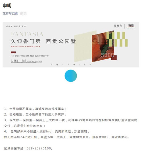 房訊網(wǎng)訊 10月28日,“花樣年西南”官微發(fā)布申明稱,全員勸退不屬實(shí),明知艱難,至今選擇留下的遠(yuǎn)大于離開;幽瓯硎荆幽辍の髂细黜(xiàng)目均在積極備戰(zhàn)美好生活空間的交付,保交付—保民生—保員工三大鐵律不變。