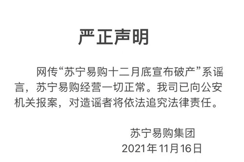 房訊網(wǎng)訊 11月16日,蘇寧易購官方微博發(fā)布嚴正聲明稱,“蘇寧易購十二月底宣布破產(chǎn)”為謠言,公司經(jīng)營一切正常。已向公安機關(guān)報案,對造謠者將依法追究法律責任。