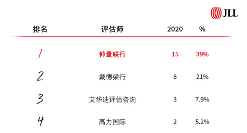 2020年,市場上共14家獨(dú)立評估機(jī)構(gòu)為38家香港主板新上市公司提供了物業(yè)評估服務(wù),其中仲量聯(lián)行參與了15宗,市場占有率約為39%,盡管受到新冠疫情對資本市場的影響,我們的市場份額仍然實(shí)現(xiàn)了2%的同比增長,蟬聯(lián)第一。根據(jù)港交所公開數(shù)據(jù),我們對14家評估機(jī)構(gòu)中的前四名進(jìn)行了排名,結(jié)果如下