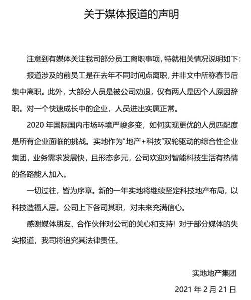 今日,實(shí)地集團(tuán)通過(guò)其官方微信公眾號(hào)發(fā)布聲明稱(chēng),報(bào)道涉及的前員工是在去年不同時(shí)間點(diǎn)離職,并非文中所稱(chēng)春節(jié)后集中離職。此外,大部分人員是被公司勸退,僅有兩人是因個(gè)人原因辭職。對(duì)一個(gè)快速成長(zhǎng)中的企業(yè),人員進(jìn)出實(shí)屬正常。