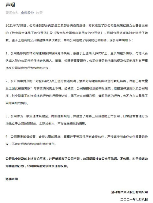此后,金科股份在官方微信公眾號(hào)發(fā)布聲明稱,公開信中提及的“對(duì)金科部分員工進(jìn)行威逼利誘,意圖對(duì)陶建和陶國(guó)林進(jìn)行栽贓陷害,目前已有大量員工因此被逼離職”與事實(shí)情況完全不符。經(jīng)核實(shí),公司根據(jù)收到的舉報(bào)線索,依據(jù)法律法規(guī)以及公司制度,對(duì)個(gè)別員工的違規(guī)違紀(jì)行為進(jìn)行調(diào)查訪談,既不存在威逼利誘、栽贓陷害的行為,也不存在大量員工因此離職的情形。