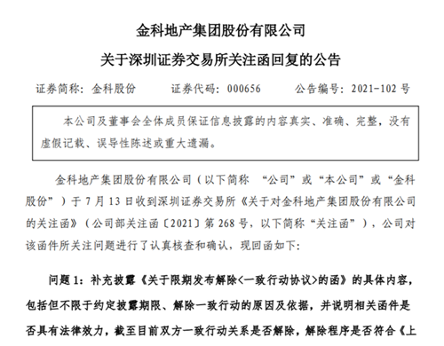 在回復(fù)函中,金科股份表示,為進一步明確各股東方意見,公司在收到關(guān)注函后,于2021年7月13日再次就是否解除一致行動關(guān)系向黃紅云先生、重慶市金科投資控股(集團)有限責(zé)任公司、陶虹遐女士及重慶虹淘文化傳媒有限公司發(fā)函問詢,“雙方均未就解除《一致行動協(xié)議》做出明確意思表示,故未產(chǎn)生解除《一致行動協(xié)議》的法律后果”。