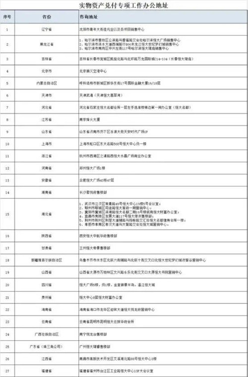 此前,恒大財(cái)富公布了27個(gè)省級(jí)行政區(qū)的實(shí)物資產(chǎn)兌付專項(xiàng)工作辦公地址。