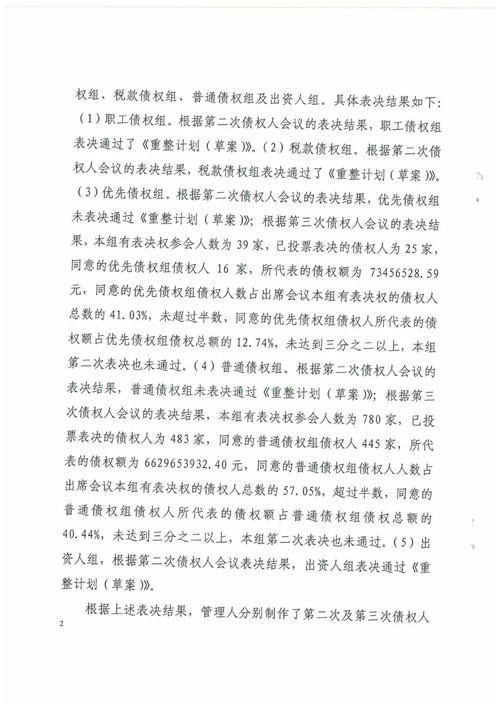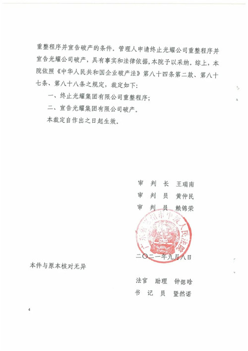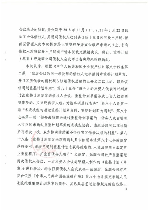 經(jīng)本案債權人會議兩次表決,《光耀集團有限公司重整計劃(草案)》均未獲得通過,光耀集團符合《中華人民共和國企業(yè)破產(chǎn)法》第二條、第八十八條規(guī)定的應終止重整程序并宣告破產(chǎn)的情形,管理人已于2021年3月15日依法向惠州中院提請裁定終止光耀集團重整程序,并宣告光耀集團破產(chǎn)。