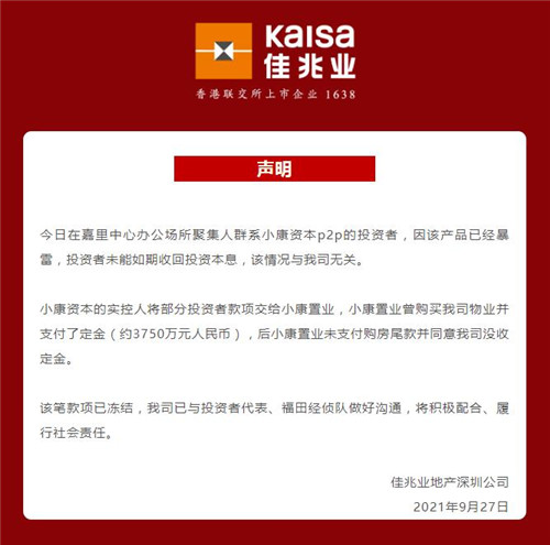 聲明顯示,小康資本的實控人將部分投資者款項交給小康置業(yè),小康置業(yè)曾購買佳兆業(yè)地產(chǎn)深圳公司物業(yè)并支付了定金約3750萬元,后小康置業(yè)未支付購房尾款并同意公司沒收定金。該筆款項已凍結(jié)在公司賬戶上,待經(jīng)偵部門下一步指示,按照法律法規(guī),公司將積極配合、履行社會責(zé)任與義務(wù)。