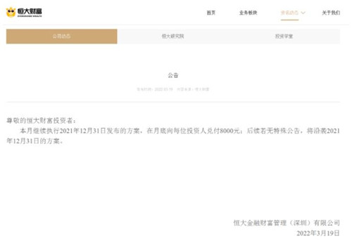 房訊網(wǎng)訊 3月19日,恒大財(cái)富官網(wǎng)公告,本月繼續(xù)執(zhí)行2021年12月31日發(fā)布的方案,在月底向每位投資人兌付8000元;后續(xù)若無特殊公告,將沿襲2021年12月31日的方案。