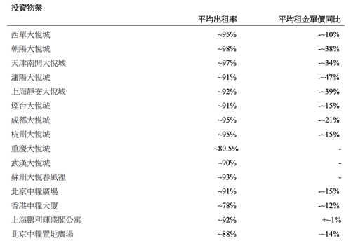 根據(jù)公告,大悅城地產(chǎn)在投資物業(yè)方面,朝陽大悅城出租率最高達(dá)98%,天津南開大悅城出租率97%排在第二,西單大悅城、成都大悅城和杭州大悅城出租率均為95%,排在第三。除了未披露平均租金單價同比情況的重慶大悅城、武漢大悅城和蘇州大悅春風(fēng)里,以及上海鵬利輝盛閣公寓同比增加1%外,其余項(xiàng)目的平均租金單價均同比下降,下降幅度最大的是沈陽大悅城,同比下降47%,其次為上海靜安大悅城,同比下降39%。物業(yè)開發(fā)方面,大悅城地產(chǎn)連同其附屬公司、聯(lián)營公司和合營公司獲得合同銷售總面積約為403013平方米,合同銷售額約162.97億元。