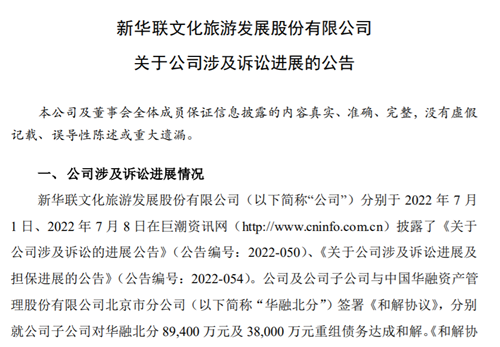 8月2日,新華聯(lián)公告稱,該公司及子公司與中國華融資產(chǎn)管理股份有限公司北京市分公司簽署了《和解協(xié)議》,兩筆共計12.74億元的重組債務(wù)達成和解。