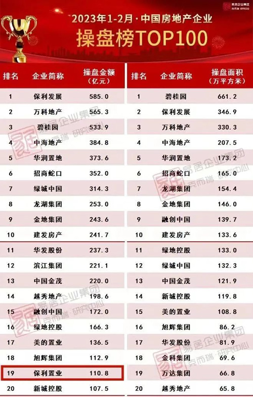 聚焦企業(yè)銷售,根據(jù)克而瑞地產(chǎn)研究中心發(fā)布2023年1-2月中國房地產(chǎn)企業(yè)操盤榜TOP100榜單中,保利置業(yè)位列第19位;銷售榜TOP100榜單中,位列第20位。2月單月全口徑位列19位、操盤位列17位、權益位列16位。行穩(wěn)致遠、穩(wěn)步前行,榮登行業(yè)前20強。(數(shù)據(jù)來源《2023年1-2月中國房地產(chǎn)企業(yè)項目銷售TOP100》)