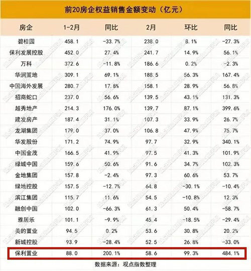 據(jù)“觀點指數(shù)”榜單顯示,前20房企權益銷售金額變動表中,保利置業(yè)1-2月實現(xiàn)同比增長200.1%。2月單月環(huán)比增長99.3%,實現(xiàn)簽約同比增長484.1%。1-2月,保利置業(yè)位居前20房企權益銷售金額同比增長率榜首,為全年奮戰(zhàn)開好頭、起好步。