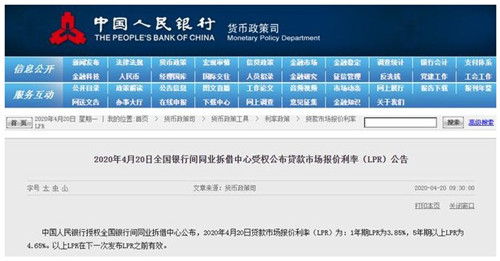 房訊網(wǎng)訊 4月20日,中國人民銀行公布新一期貸款市場報(bào)價(jià)利率(LPR)為:1年期LPR為3.85%,5年期以上LPR為4.65%。