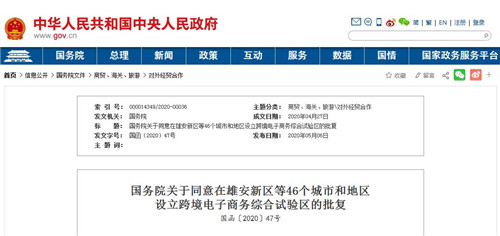 房訊網(wǎng)訊 5月6日,國務(wù)院發(fā)布《關(guān)于同意在雄安新區(qū)等46個(gè)城市和地區(qū)設(shè)立跨境電子商務(wù)綜合試驗(yàn)區(qū)的批復(fù)》,批復(fù)同意在雄安新區(qū)等46個(gè)城市和地區(qū)設(shè)立跨境電子商務(wù)綜合試驗(yàn)區(qū)。