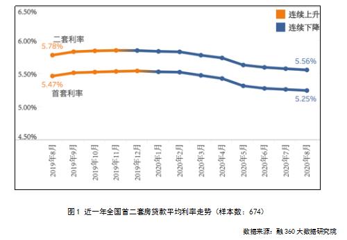房訊網(wǎng)訊 據(jù)融360大數(shù)據(jù)研究院對全國41個重點城市674家銀行分支機構(gòu)房貸利率的監(jiān)測數(shù)據(jù)顯示,2020年8月(7月20日-8月18日),全國首套房貸款平均利率為5.25%,環(huán)比下調(diào)1BP;二套房貸款平均利率為5.56%,環(huán)比下降2BP。