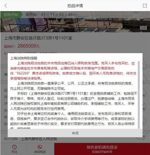 房訊網(wǎng)訊 上海法拍房首次被納入限購(gòu),競(jìng)買者需具備上海市購(gòu)房資格。近日在公拍網(wǎng)首頁(yè),一套位于上海市靜安區(qū)曲沃路373弄1號(hào)1101室,將于3月8日10時(shí)拍賣,起拍價(jià)為286.5萬(wàn)元,醒目位置標(biāo)準(zhǔn)了黃色字體“限購(gòu)”。頁(yè)面自動(dòng)彈出提醒:上海法院司法拍賣的上海市商品住房已納入限購(gòu)政策范圍。拍賣成交確認(rèn)后,因買受人無(wú)購(gòu)房資格的,將依法承擔(dān)悔拍等法律后果。