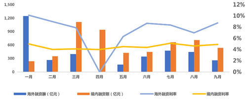 2020年1-9月房企境內(nèi)及海外債總額(億元)&發(fā)行利率